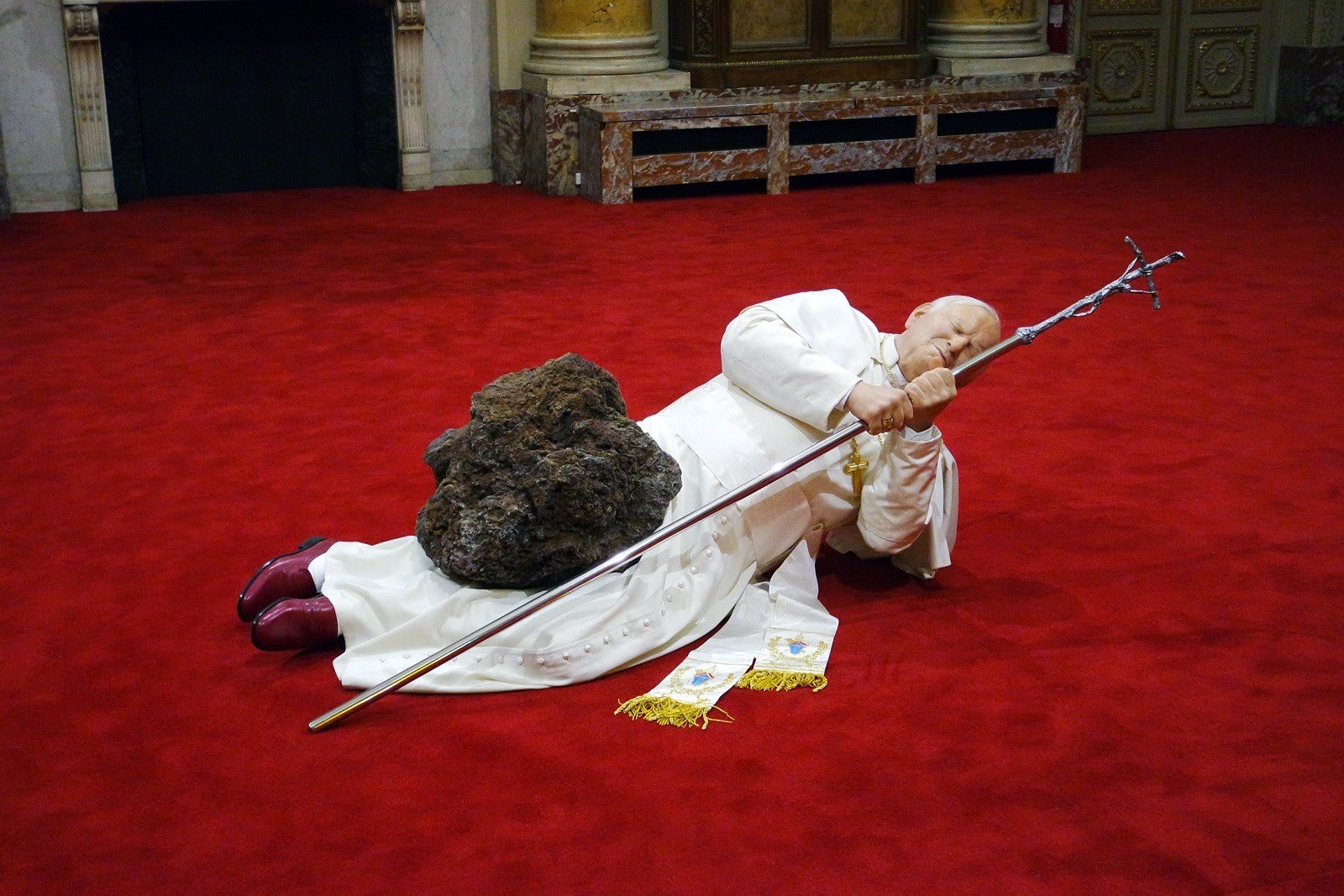 With La Nona Ora, Maurizio Cattelan controversially depicts Pope John Paul II lying on the ground, as if struck by a meteorite. This sculpture sparked outrage particularly in Poland, a nation closely associated with the pontiff. The work was perceived as deliberately provocative and deeply disrespectful, stirring extensive debate regarding religious representation in contemporary art.